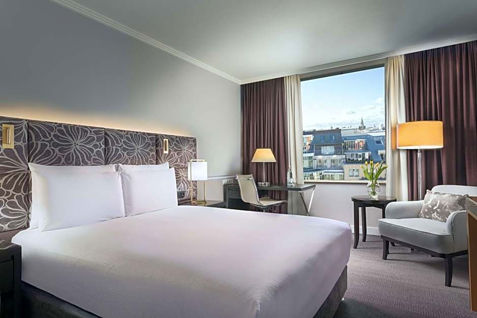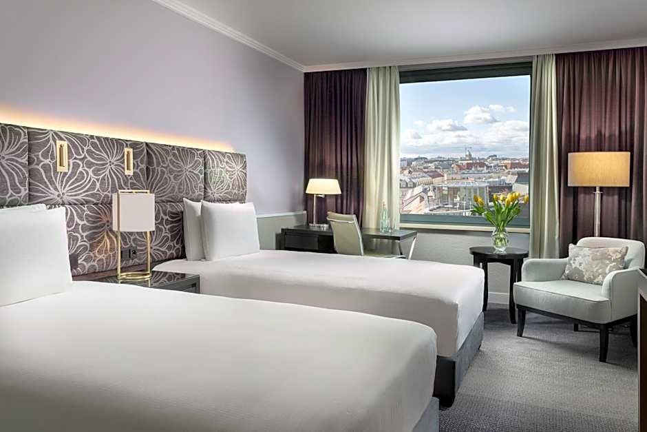 Located on one of the hotel’s higher floors, the King Executive Room combines refined design with Art Deco touches like a statement headboard, reading lamp, and elegant bedside lighting. Guests enjoy access to the Executive Lounge which offers free Wi-Fi, drinks, and snacks throughout the day, plus complimentary water, bathrobes, and slippers. The room includes a hardwood desk with USB sockets, a 55-inch TV, and a mini-refrigerator. The marble bathroom features a walk-in shower or bathtub and complimentary toiletries. Please note, that it is not possible to place an extra bed in this room.